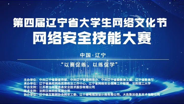 本届大赛由中共辽宁省委宣传部、中共辽宁省委网络安全和信息化委员会办公室、中共辽宁省委教育工作委员会、辽宁省教育厅共同主办,辽宁省高校网络思想政治工作中心、辽宁省网络安全保障工作联盟、沈阳理工大学联合承办,沈阳汉林科技有限公司提供技术支持,江苏君立华域信息安全技术股份有限公司提供平台支持,辽宁省互联网协会网络安全工作委员会、辽宁邮电规划设计院有限公司、大连致远信息技术有限公司协办。