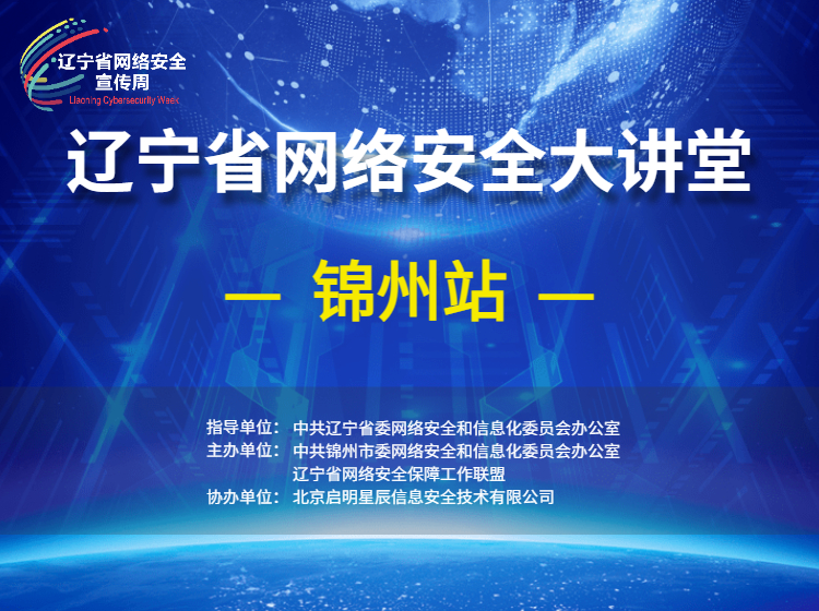 2021年辽宁省网络安全大讲堂【锦州站】 讲课主题:《没有绝对的安全》 指导单位:中共辽宁省委网信办 主办单位:中共锦州市委网信办、辽宁省网络安全保障工作联盟 协办单位:北京启明星辰信息安全技术有限公司